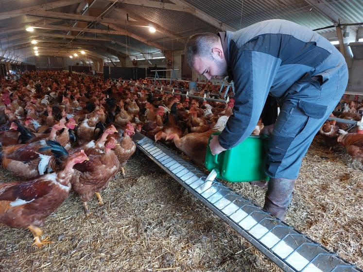 À Verneil-le-Chétif, Julien Foureau, épaulé par son salarié Armand Chouanet, conduit des volailles festives de Loué. Le Gaec du Petit Moulin a fait le choix de donner du lait de ses vaches aux chapons en phase de finition.